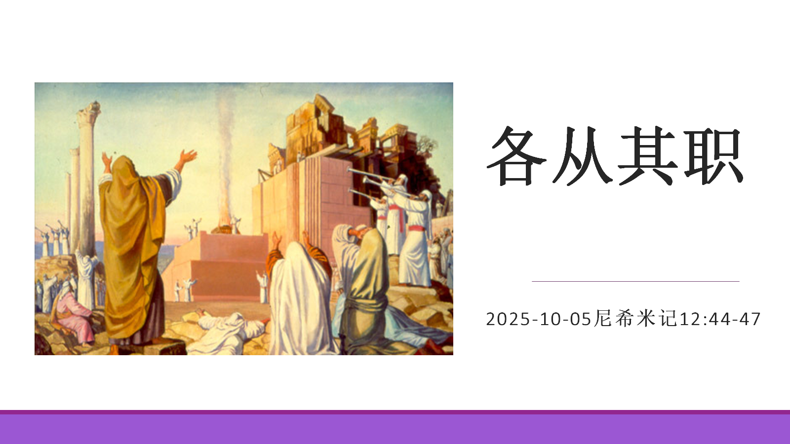 亲爱的弟兄姐妹,“告成之礼”之后,圣殿的侍奉工作并没有因此而结束,反而是在持续有序的进行,甚至是加倍地侍奉。如果说“告成之礼”指向教会诞生的话,那么,“各从其职”将持续到教会被更新为圣洁的新妇为止。如果说“告成之礼”指向了圣洁的新妇与新郎完婚的话,那么,“各从其职”则指向了神的百姓在圣城新耶路撒中的侍奉,直到永永远远。不仅如此,从“犹大人”到“以色列众人”;从“管理圣殿库房的人”到“圣殿忠心又良善的管家”;从“歌唱的、守门的”到“歌唱的伶长”;从“利未人”到“祭司”…他们就是我们的真实写照,他们如此侍奉,我们也当如此行。他们一同互为肢体,彼此坚固,互相扶持,并在神的宝座前昼夜侍奉神,我们更当如此。我们倡导并践行基督教重建,最终的目标就是为此,如经上所记:9此后,我观看,见有许多的人,没有人能数过来,是从各国、各族、各民、各方来的,站在宝座和羔羊面前,身穿白衣,手拿棕树枝,10大声喊着说:“愿救恩归与坐在宝座上我们的神,也归与羔羊。”11众天使都站在宝座和众长老并四活物的周围,在宝座前面伏于地敬拜神,12说:“阿们!颂赞、荣耀、智慧、感谢、尊贵、权柄、大力都归与我们的神,直到永永远远。阿们!”13长老中有一位问我说:“这些穿白衣的是谁?是从哪里来的?”14我对他说:“我主,你知道。”他向我说:“这些人是从大患难中出来的,曾用羔羊的血把衣裳洗白净了。15所以,他们在神宝座前,昼夜在他殿中侍奉他。坐宝座的要用帐幕覆庇他们。16他们不再饥、不再渴,日头和炎热也必不伤害他们,17因为宝座中的羔羊必牧养他们,领他们到生命水的泉源,神也必擦去他们一切的眼泪。”(启示录7:9-17)。阿们!