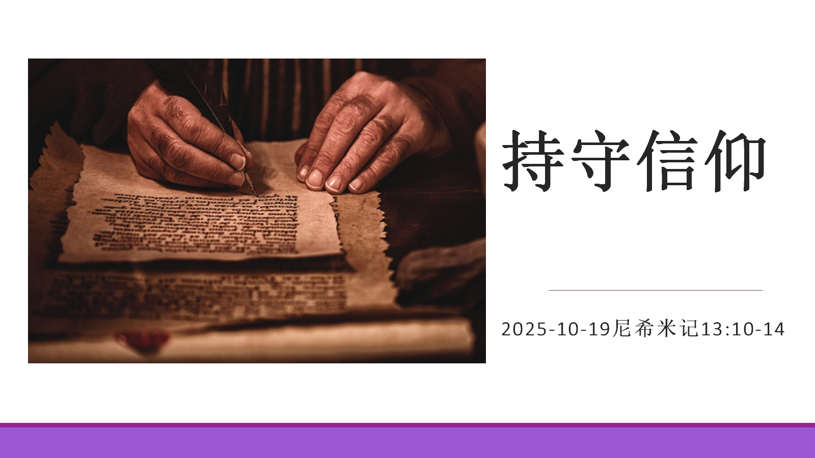 感谢主的话语!紧接上一周的主日证道,需要注意以下的时间描述:“对耶路撒冷行告成之礼的时候”(尼希米记12:27)、“当日”(尼希米记12:44)、“当日”(尼希米记13:1)、“先是,就是在这之前”(尼希米记13:4)、“那些日子”(尼希米记13:15)、“那些日子”(尼希米记13:23)。一方面,尼希米记12:27-13:31将是整卷尼希米记的“结语部分”,并且完全平行与启示录21-22章,人类、世界以及神的百姓最后的结局。新天新地,圣城新耶路撒冷,就是主的新妇,主的教会。另一方面,这“结语部分”的历史叙述,将是按时间的先后秩序而编辑排列的。换言之,尼希米记12:27-13:31至少强调以下历史事实:第一,尼希米带领神的百姓将圣城新耶路撒冷奉献给神,也就是对其行“告成之礼”的时候,乃是尼希米第二次从巴比伦王亚达薛西那里返回犹大地的圣城耶路撒冷的时候(尼希米记13:4-9)。第二,“当日”就是行“告成之礼”的日子。第三,“先是,就是在这之前”乃是指在行告成之礼之前的日子,这也意味着尼希米记13:4-31的所有历史叙述,都是发生在“告成之礼”之前的,包括两次“那些日子”。第四,“先是”洁净圣殿(4-9)与持守信仰(10-14),“那些日子”重返安息与遵守律法(15-22),“那些日子”离婚运动与弃绝偶像(23-31),这些历史事件都将是为行告成之礼作预备的。没有这些预备与更新,悔改与重建,行告成之礼将是毫无意义,毫无可能的。第五,尼希米记最后结束的地方应当是一场“告成之礼”(尼希米记12:27-13:3),其中包括“各从其职、分别为圣”。为此,神的百姓当与一切的“闲杂人”分别出来。所谓的“闲杂人”参考上周主日证道的相关讲论,只是今天,闲杂人正充满整个主流基督教,其主要表现为“倡导并践行巴兰和尼哥拉一党之人教训”的人。我们倡导并践行基督教重建,就是要将其抛之殿外,视之如粪土,彻底弃绝。第六,我们今天的证道经文,以及“持守信仰”的证道主题,也正是为此(尼希米记13:10-14)。这是一个基本常识——洁净圣殿之后,便是持守信仰。因为唯有忍耐到底、弃绝“闲杂人之教训”的,才能得救(马太福音24:13,启示录2-3章等)。第七,那么,在这末世,我们将如何持守信仰呢?返回圣经,返回常识。在人不能,在神凡事都能。这是使徒的劝勉:14你们和不信的原不相配,不要同负一轭。义和不义有什么相交呢?光明和黑暗有什么相通呢?15基督和彼列有什么相和呢?信主的和不信主的有什么相干呢?16神的殿和偶像有什么相同呢?因为我们是永生神的殿,就如神曾说:我要在他们中间居住,在他们中间来往。我要作他们的神,他们要作我的子民。17又说:你们务要从他们中间出来,与他们分别,不要沾不洁净的物,我就收纳你们。18我要作你们的父,你们要作我的儿女。这是全能的主说的。1亲爱的弟兄啊,我们既有这等应许,就当洁净自己,除去身体、灵魂一切的污秽,敬畏神,得以成圣。(哥林多后书6:14-7:1)。阿们!