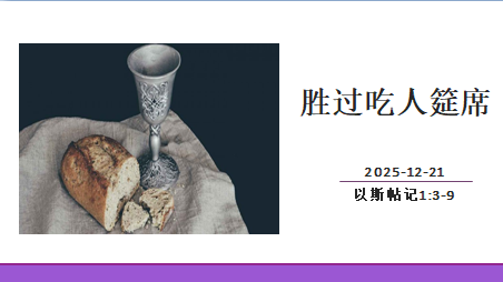 感谢主的话语。今天是圣诞节主日,首先,祝愿大家圣诞快乐。还是那个老生常淡的话题,何为圣诞?很多的基督徒,以及这世代的人,离圣经所启示的圣诞已是越来越远了。他们所谓的“圣诞节”就是一场经过世俗化、异教化、甚至是邪教化之后的圣诞吃喝或消费表演,本质上还是一场吃人的筵席,东西方都是一样。那么,何为圣经所启示的圣诞呢?简而言之就是那位生来作王的人(拿撒勒人耶稣)为我们诞生了,祂就是主基督,神的儿子,正如马太福音2:1-6所说的,1当希律王的时候,耶稣生在犹太的伯利恒。有几个博士从东方来到耶路撒冷,说:2“那生下来作犹太人之王的在哪里?我们在东方看见他的星,特来拜他。”3希律王听见了,就心里不安;耶路撒冷合城的人也都不安。4他就召齐了祭司长和民间的文士,问他们说:“基督当生在何处?”5他们回答说:“在犹太的伯利恒。因为有先知记着,说:6‘犹大地的伯利恒啊,你在犹大诸城中并不是最小的,因为将来有一位君王要从你那里出来,牧养我以色列民。’”其次,圣诞节主日,我们将藉着以斯帖记1:3-9来看“胜过吃人筵席”的真理。这部分真理也与上一次以斯帖记1:1-2的证道内容是息息相关的。我们如何胜过吃人筵席呢?唯有藉着重建基督教会才是可能的。今天世界的败坏,本质是主流基督教的败坏。主流基督教要为这世代的败坏承担主要责任。为此,当下的世代便是重建基督教会的世代了。唯有重建,才有希望。最后,今天的证道经文是如何与圣诞信息相关联呢?感谢神,这是答案,即藉着“食物-吃-筵席”的真理。以斯帖记中的筵席,被吃的对象是人,包括亚哈随鲁王以及王后瓦实提,各位大臣等,这是这世代所有吃人筵席的代表。而圣诞中被吃的对象则是耶稣基督自己,祂就是生命的粮,祂要取代或胜过吃人筵席。一方面,耶稣降生在“食槽”,即马槽:1当那些日子,凯撒奥古斯都有旨意下来,叫天下人民都报名上册。2这是居里扭作叙利亚巡抚的时候,头一次行报名上册的事。3众人各归各城,报名上册。4约瑟也从加利利的拿撒勒城上犹太去,到了大卫的城,名叫伯利恒,因他本是大卫一族一家的人,5要和他所聘之妻马利亚一同报名上册。那时马利亚的身孕已经重了。6他们在那里的时候,马利亚的产期到了,7就生了头胎的儿子,用布包起来,放在马槽里,因为客店里没有地方。8在伯利恒之野地里有牧羊的人,夜间按着更次看守羊群。9有主的使者站在他们旁边,主的荣光四面照着他们,牧羊的人就甚惧怕。10那天使对他们说:“不要惧怕,我报给你们大喜的信息,是关乎万民的。11因今天在大卫的城里,为你们生了救主,就是主基督。12你们要看见一个婴孩,包着布,卧在马槽里,那就是记号了。”(路加福音1:1-12)。另一方面,26他们吃的时候,耶稣拿起饼来,祝福,就擘开,递给门徒,说:“你们拿着吃,这是我的身体。”27又拿起杯来,祝谢了,递给他们,说:“你们都喝这个,28因为这是我立约的血,为多人流出来,使罪得赦。29但我告诉你们:从今以后,我不再喝这葡萄汁,直到我在我父的国里同你们喝新的那日子。”(马太福音26:26-29)。阿们!